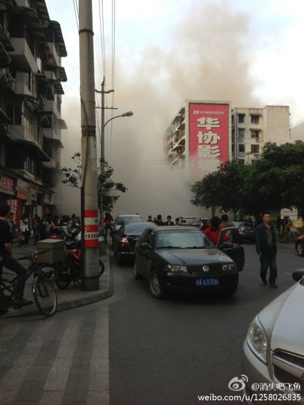 成都#铂金城#附近楼房倒塌,华协影城整栋楼倒向路中间,“灰尘蔓延到40、50米外”。据目击者表示,有人被埋在废墟中,消防部门已经使用搜救犬和生命探测仪探测倒塌现场。