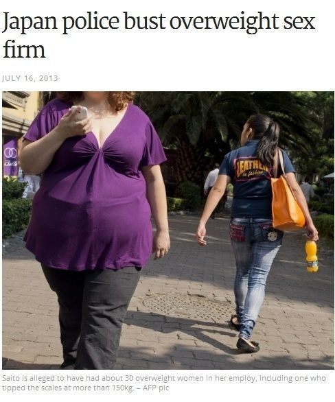 法新社报道,日本警方破获一个由30名胖妞组成的卖淫团伙,其中一个体重超过150公斤。该团伙称,现在胖女人非常受日本男人欢迎,所以看到商机。她们的运作模式是,以“保健”为名刊登广告,然后进行上门卖淫服务。报道称,短短三年,该团队已经赚取超过400万美元。