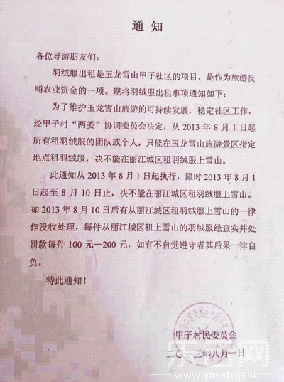 村民通知:为了维护玉龙雪山旅游的可持续发展,稳定社区工作,经甲子村“两委”协调委员会决定,从2013年8月1日起所有租羽绒服的团队或个人,只在玉龙雪山旅游景区指定租羽绒服,决不能在丽江城区租羽绒服上雪山。