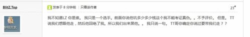 Top:我不知道LZ(指爆料网友)你是谁。我只是一个选手。前面你说他坑多少多少钱这个我不能考证真伪..不予评价。但是,关于TT说我们想跟他走,然后他回绝了我后所以我们出来黑他,我只说一句,TT哥你确定你说过要带我们走??