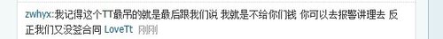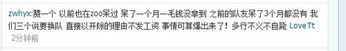 Loup:说实话看到TT说这样的话我很遗憾,虽然我不知道具体数目,但是我生病在家3个月的工资,我问了我们老板是有的,但是他没给我发。
