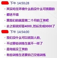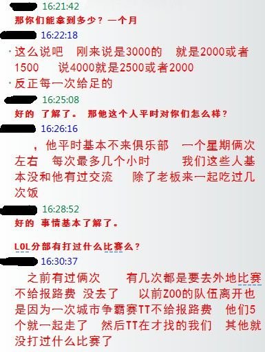 除此之外,知情人士向小编爆光了与ZOO LOL分部教练的聊天记录,教练称俱乐部吃住的环境没有可挑剔的,正式队员虽然说被克扣了工资,但是比起训练生好的多,训练生是没有任何基础工资,有的甚至要交钱才能训练。