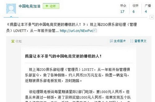 昨日,一名网名为“中国电竞加油”的网友发布了一条名为《揭露让本不景气的中国电竞变更的糟糕的人!》近千字的博文,内容主要为“揭露中国ZOO电竞俱乐部(设星际2与英雄联盟 (微博)分部)经理,前星际1、2职业选手LoveTT做假账被发现后离队”的倳件,以下是微博原文: