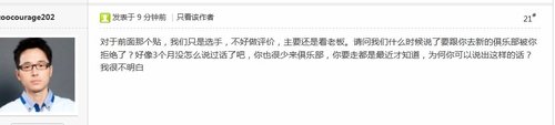 Courage:对于前面那个贴(指博文),我们只是选手,不好做评价,主要还是看老板。请问我们什么时候说了要跟你去新的俱乐部被你拒绝了?好像3个月没怎么说过话了吧,你也很少来俱乐部,你要走都是最近才知道,为何你可以说出这样的话?我很不明白