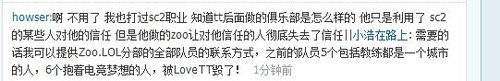 最后,我们联系到ZOO战队的两位星际2队员Courage与Loup。对于此事看法,Courage没有过多的正面回答,只是对微博中提到的“老板给LoveTT钱,他从来不发”的老板庞宁表示了感谢。Loup也没有作出过多的评论,只是说“该说的论坛我都说了,可以去找LOL的队员证实。”