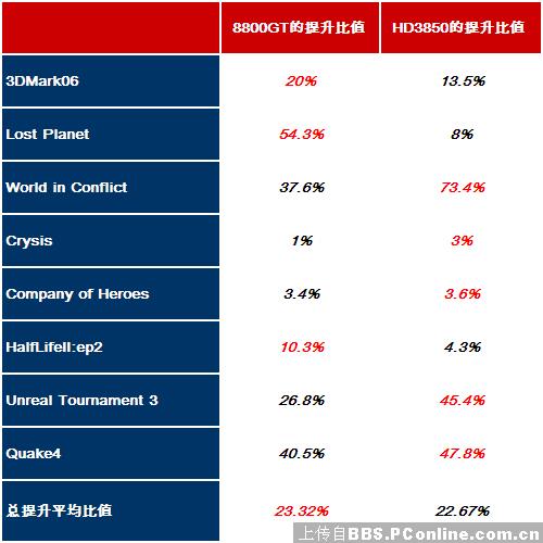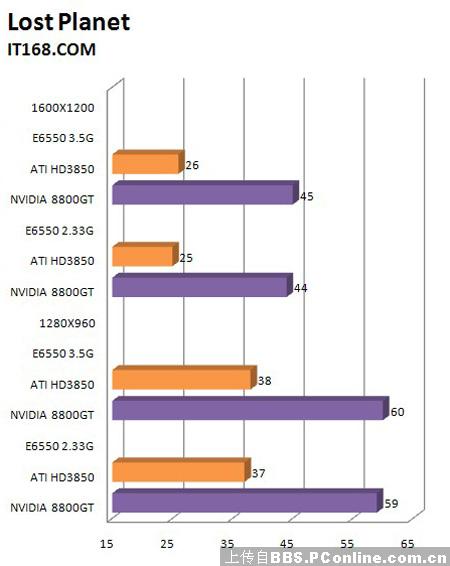 冲突世界这款备受欢迎的即时战略性游戏,各种爆炸场面对整机性能要求甚高,爆炸所带来的各种效果需要大量的渲染运算,就从HD3850搭配超频前后的E6550所测试出来的成绩足以证明一切,接近73.4%的性能提升比值让我们为之一震,同时也得知CPU的性能对冲突世界这款游戏流畅度起了决定性的作用,另一方面8800GT在CPU超频前后的性能提升比值也达到了37.6%。