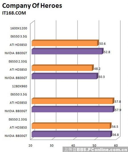 英雄连这款以二站为主题的即时战略性游戏,人物与武器都是刻画得栩栩如生,而且战斗场景逼真丰富,体验着显卡的整体性能。从测试成绩来看,CPU的效能完全影响不到显卡性能的发挥,英雄连对CPU性能的不敏感,因此在测试当中超频前后成绩差距不明显,8800GT的提升比值仅为3.4%,而HD3850的提升比值为3.6%。
