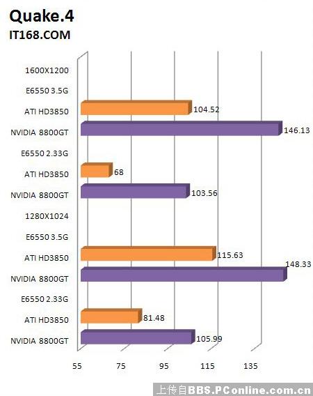 作为OpenGL游戏的Quake4在测试当中,更多需要渲染的像素和特效表现都必须依靠CPU、显卡以及内存的性能,任何一个配件性能的稍微提升都会带来成绩明显的上升。8800GT搭配3.5G的E6550想对比没超频的成绩来看,提升比值可达40.5%,而反观HD3850方面,超频后的提升比值达到47.8%。