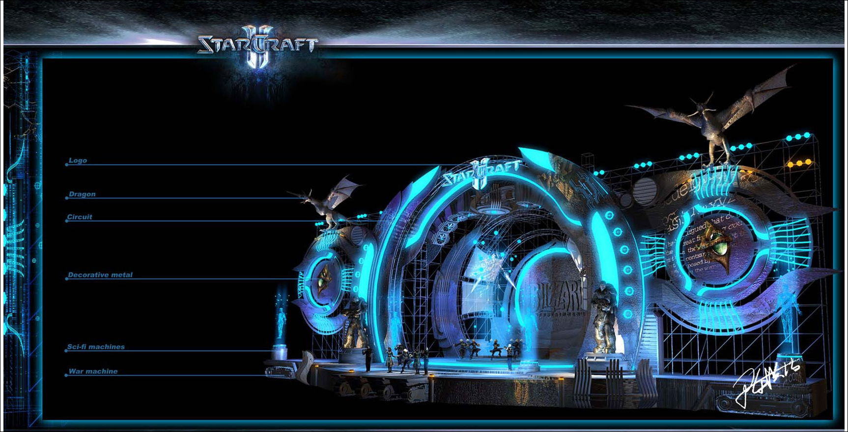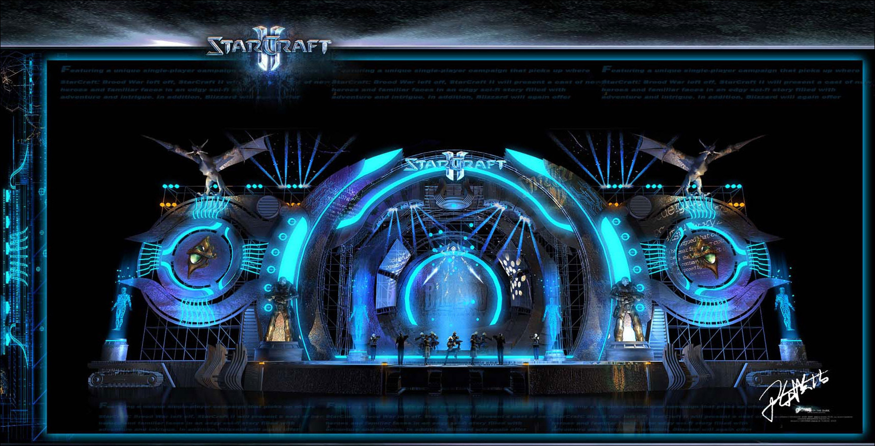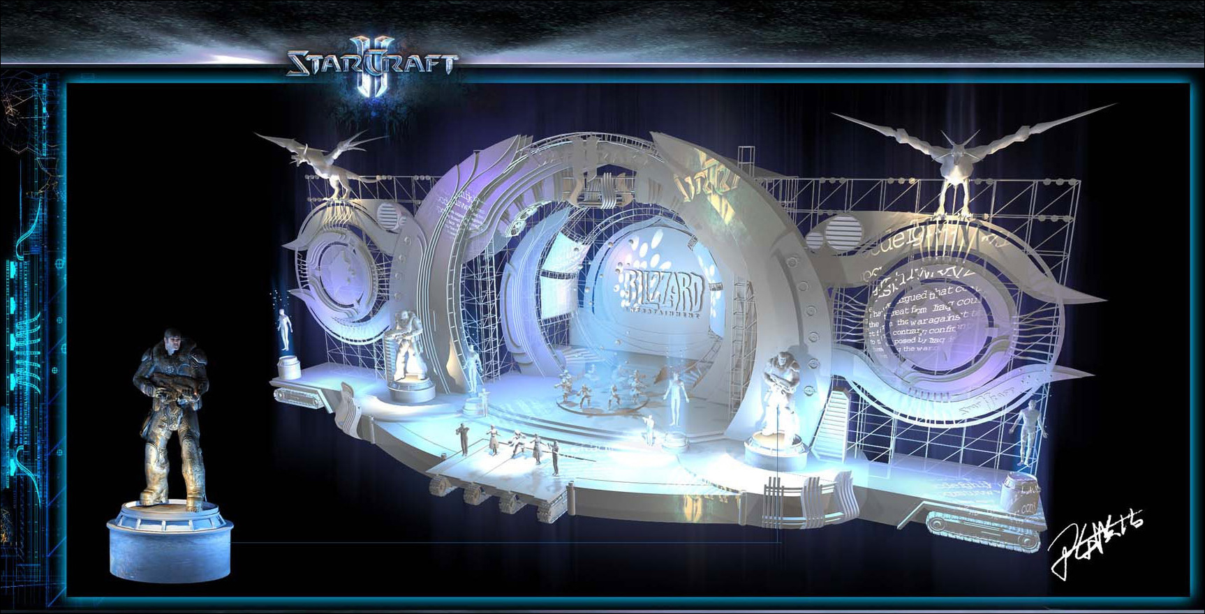 难道一直以来拥有难听的跳票名声的暴雪,终于肯发狠一回了么? 即便是在展台设计上,暴雪也力求做到最好。流出的样稿以神族的时空门为主体,带入多种星际元素,同时配以高达数米的构架,不仅切合游戏主题,而且显得大气磅礴,科幻感十足!如同游戏一样,整个展台带给人梦幻一般的感觉,简直无可挑剔!